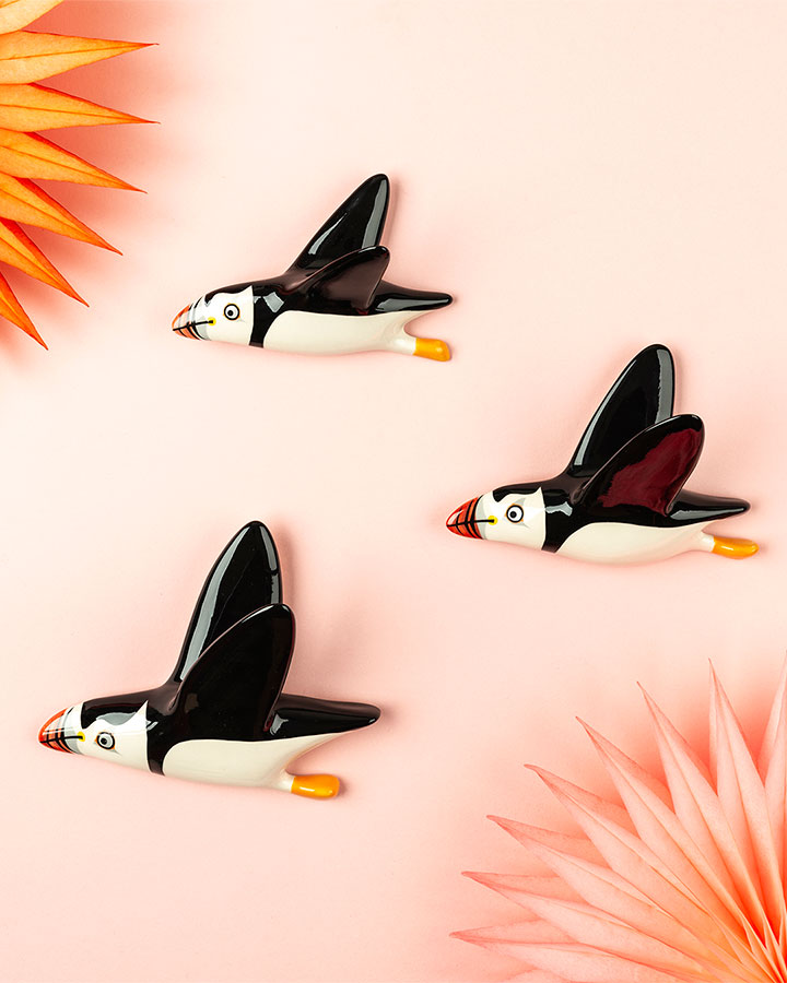 ★★★★★These flying puffins are exceptionally well made and with excellent hanging instructions that anybody can follow they quickly have pride of place on the wall. Fast service and professional packing meant they arrive without any damage.