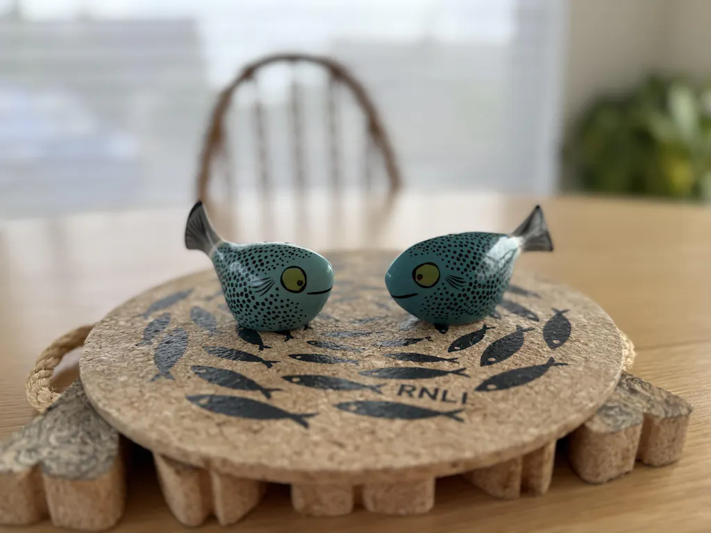 Handmade ceramic blue fish egg cup, spoons and salt and pepper shakers by Hannah Turner