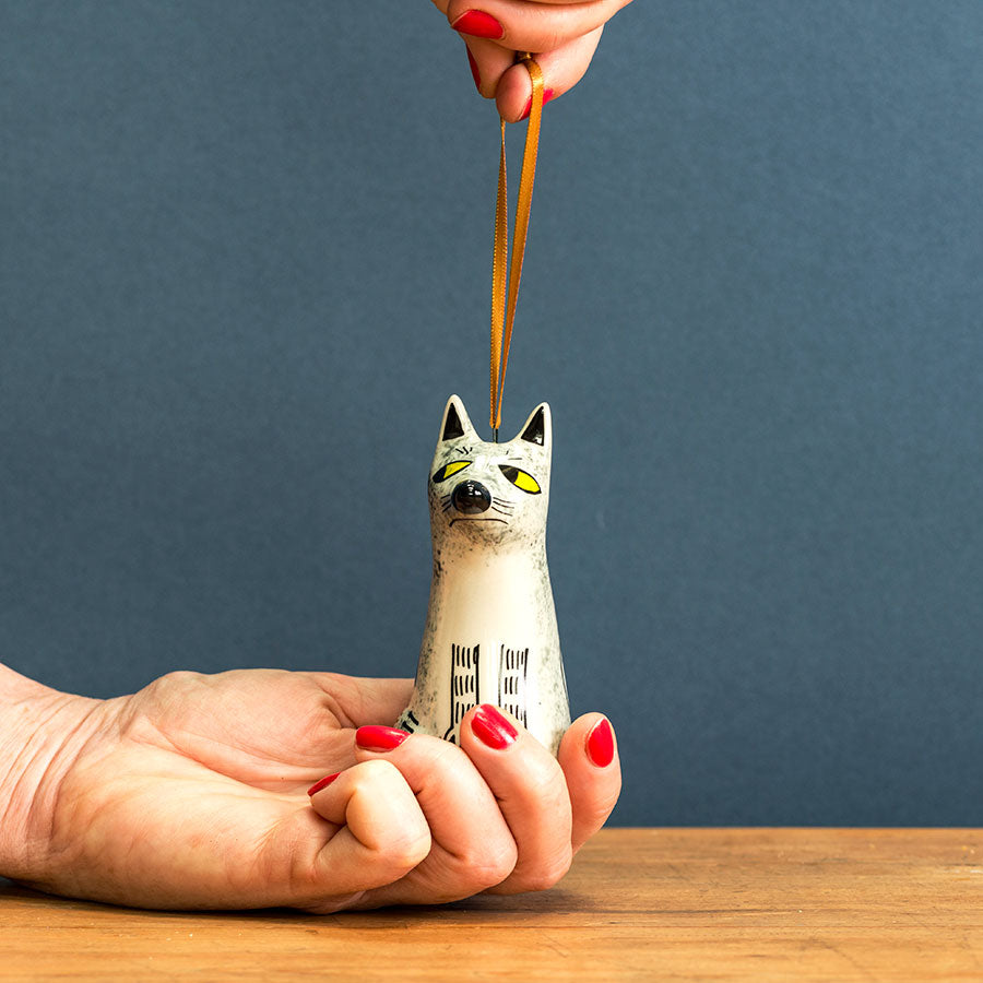Give Yuletide some woodland fairytale magic with our new Wolf Hanging Decoration. Straight out of a Grimm's story, with their snappy muzzles, pointy ears, and handsome hand-painted finish. Why not bring a bit of mischief to your Christmas tree? This wolf is all the better in a pack, too! for a truly wild home and kitchen, see our Wolf Egg Cup and Wolf Salt and Pepper Shakers.